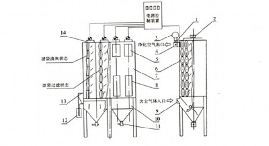 含塵氣體由進(jìn)氣管進(jìn)入灰斗,再向上經(jīng)由箱體內(nèi)的濾袋凈化后,由電動(dòng)三通閥開啟的主閥板處排至出氣管,出氣管的氣體再經(jīng)離心風(fēng)機(jī),煙囪排入大氣中。